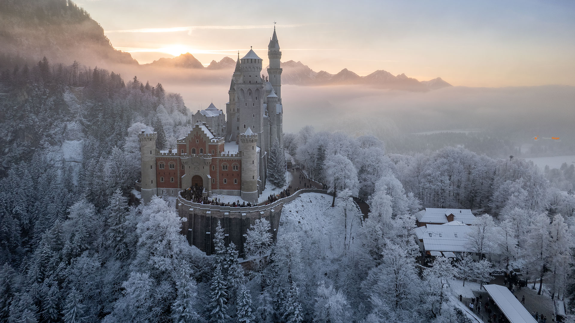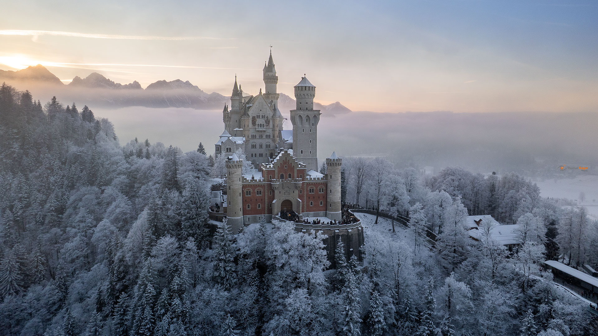 Schloss Neuschwanstein zum Sonnenuntergang im WInterkleid